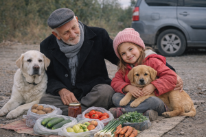 Na ivici jednog prometnog puta, tamo gdje većina automobila samo uspori na trenutak i nastavi dalje, svakog jutra može se vidjeti ista slika. Na staroj prostirci, pažljivo raspoređene vrećice povrća, nekoliko tegli domaće zimnice i dva mala psa koji strpljivo sjede pored. Iza svega toga sjede djed i njegova unučica.